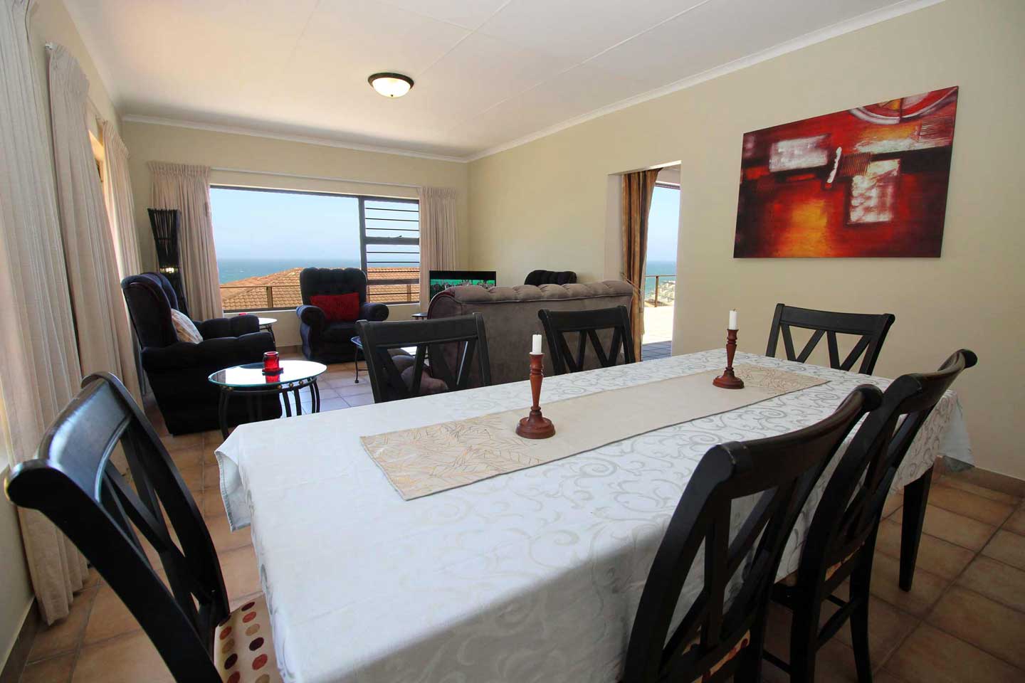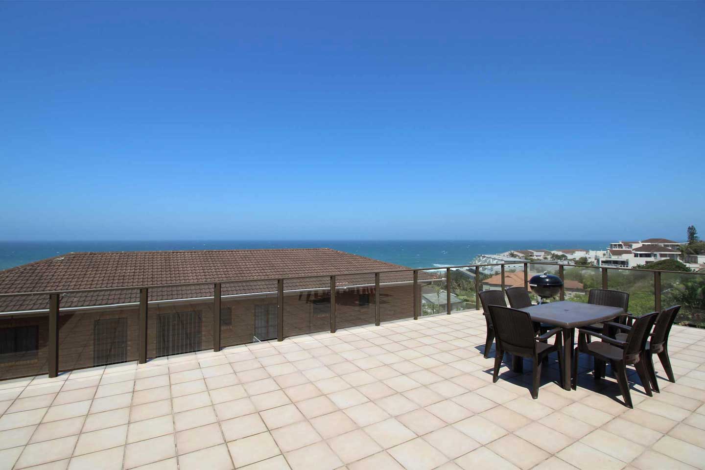 Take leisurely strolls from the 8 sleeper to the sea front or Ramsgate’s “Blue Flag Beach” just 580m away, where you can enjoy the famous Waffle House and Blue Lagoon Restaurant. Gaze out to sea from the large sundeck patio while you sip a sun downer and sizzle some steaks on the braai. The fully equipped kitchen has an extra length breakfast bar for those lazy holiday mealtimes with a dining room for those more formal holiday meals. There is a double motorized lock up garage at the 4 bedroom self-catering holiday house for your vehicles.