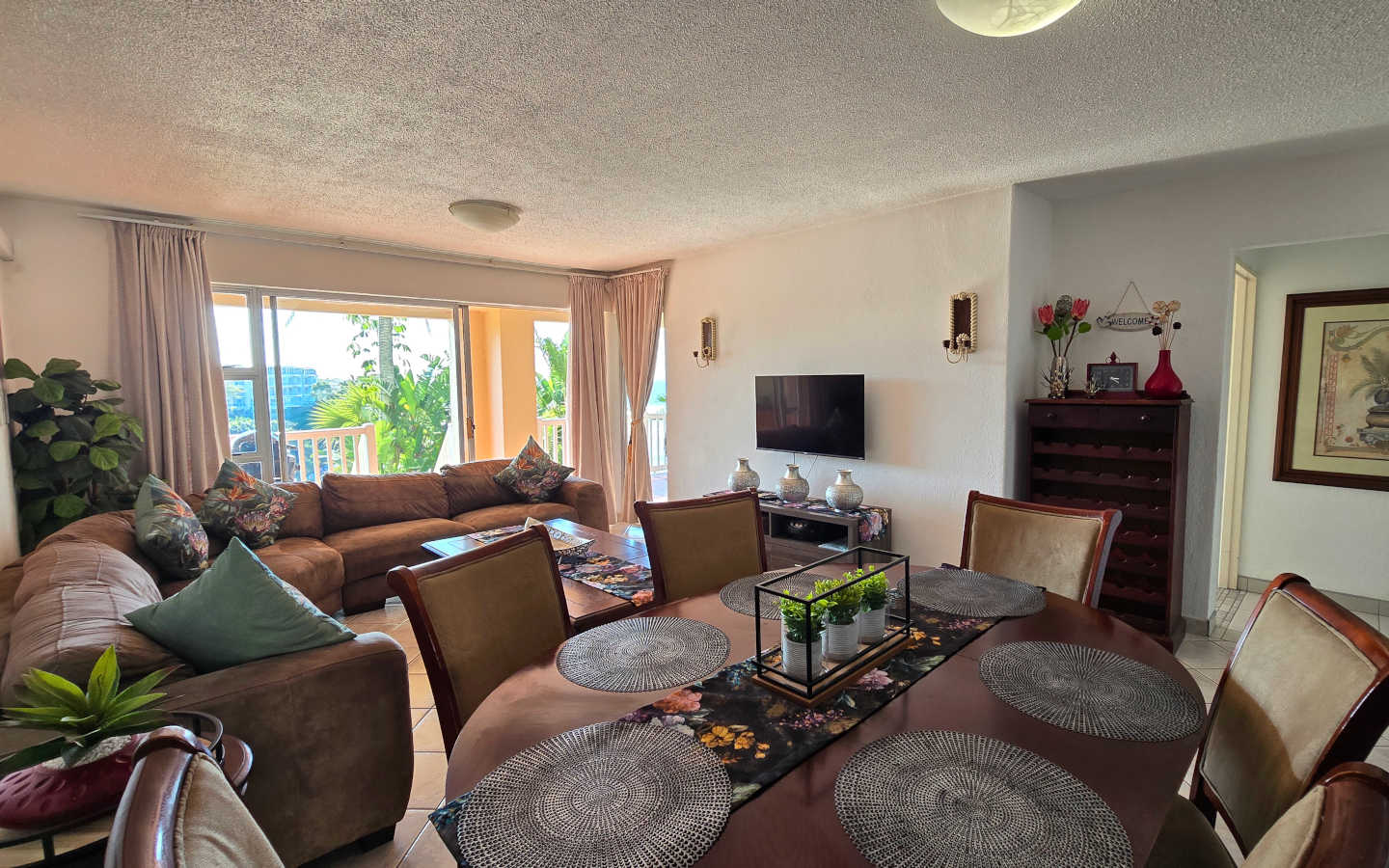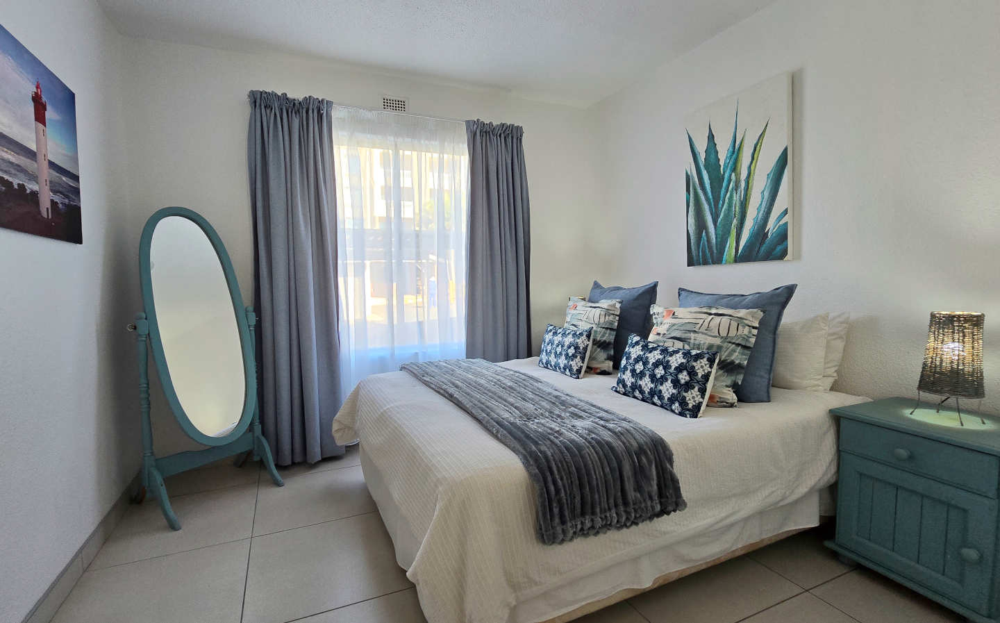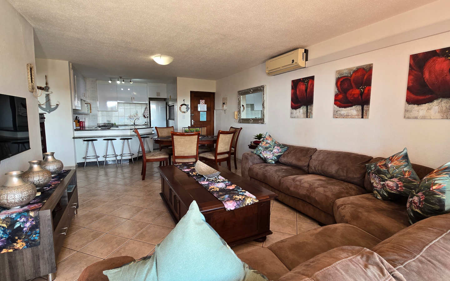 Laguna la Crete 84 is a tastefully furnished and tiled six sleeper, ground floor self-catering flat in Uvongo next to the Uvongo Lagoon. Spend your beach holiday in Uvongo at this tasteful apartment which comes with an air conditioner in the lounge and full DSTV supplied.  There is a swimming pool and tennis courts in the well maintained complex. The seafront resort style complex has controlled access and security guards.