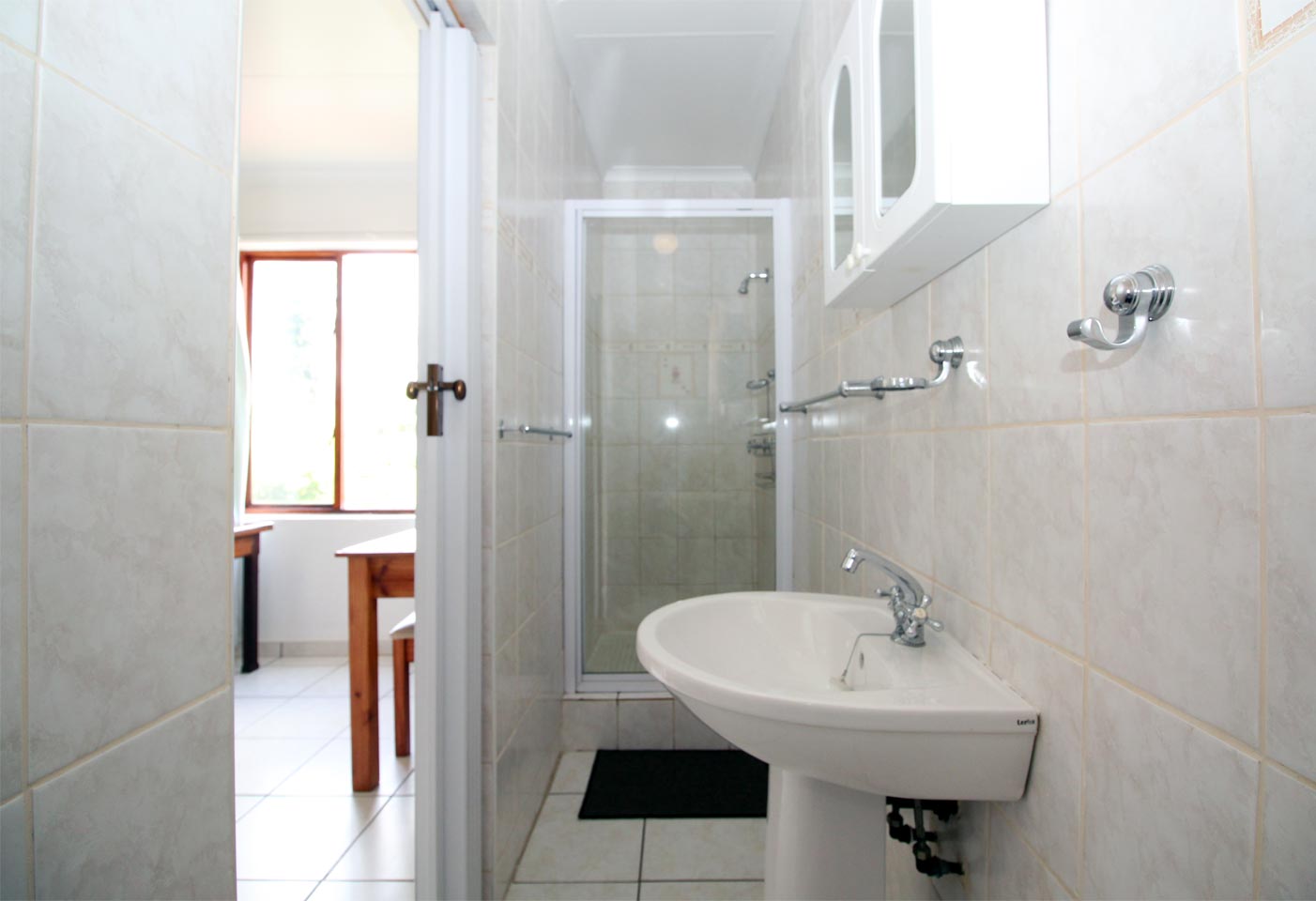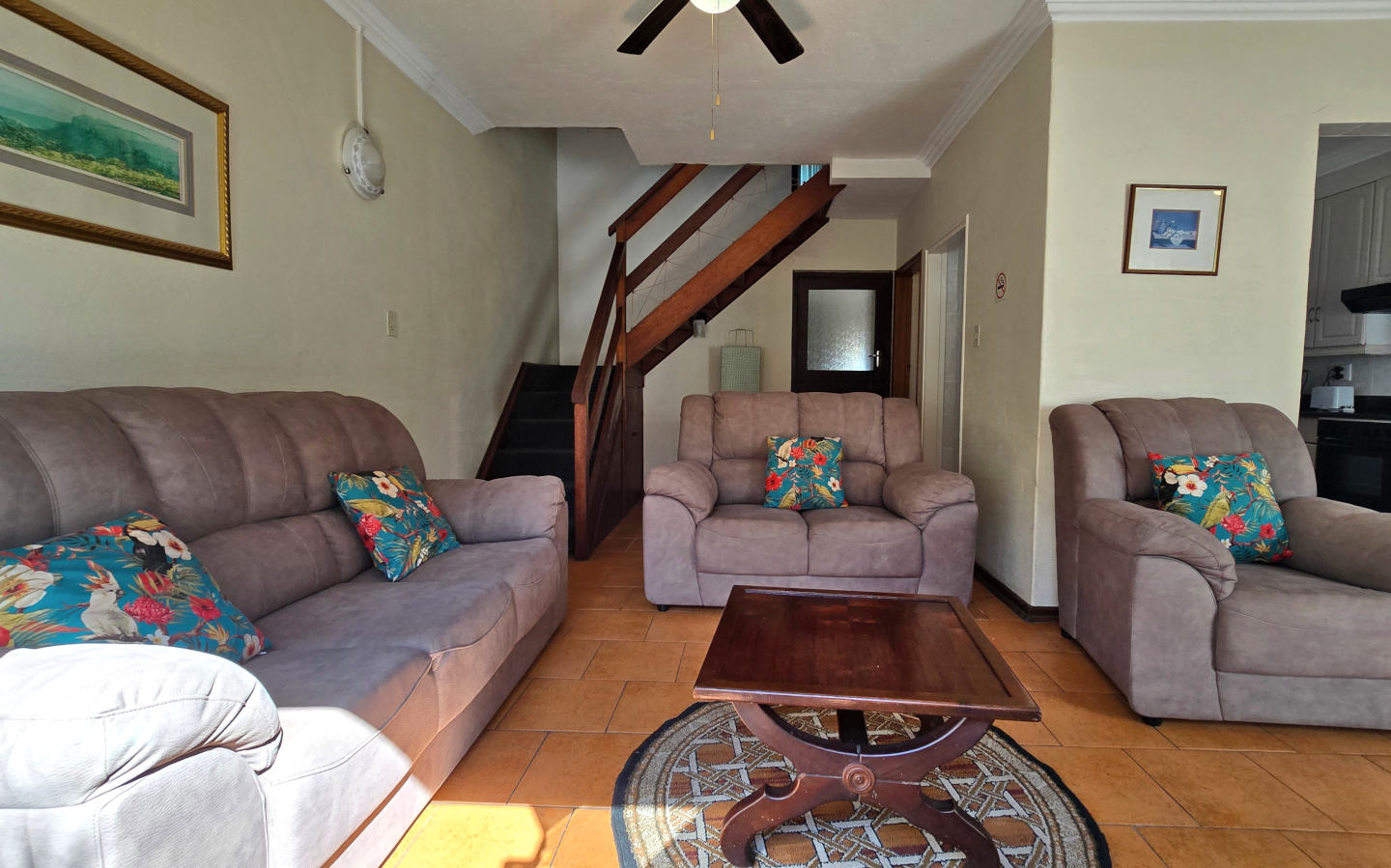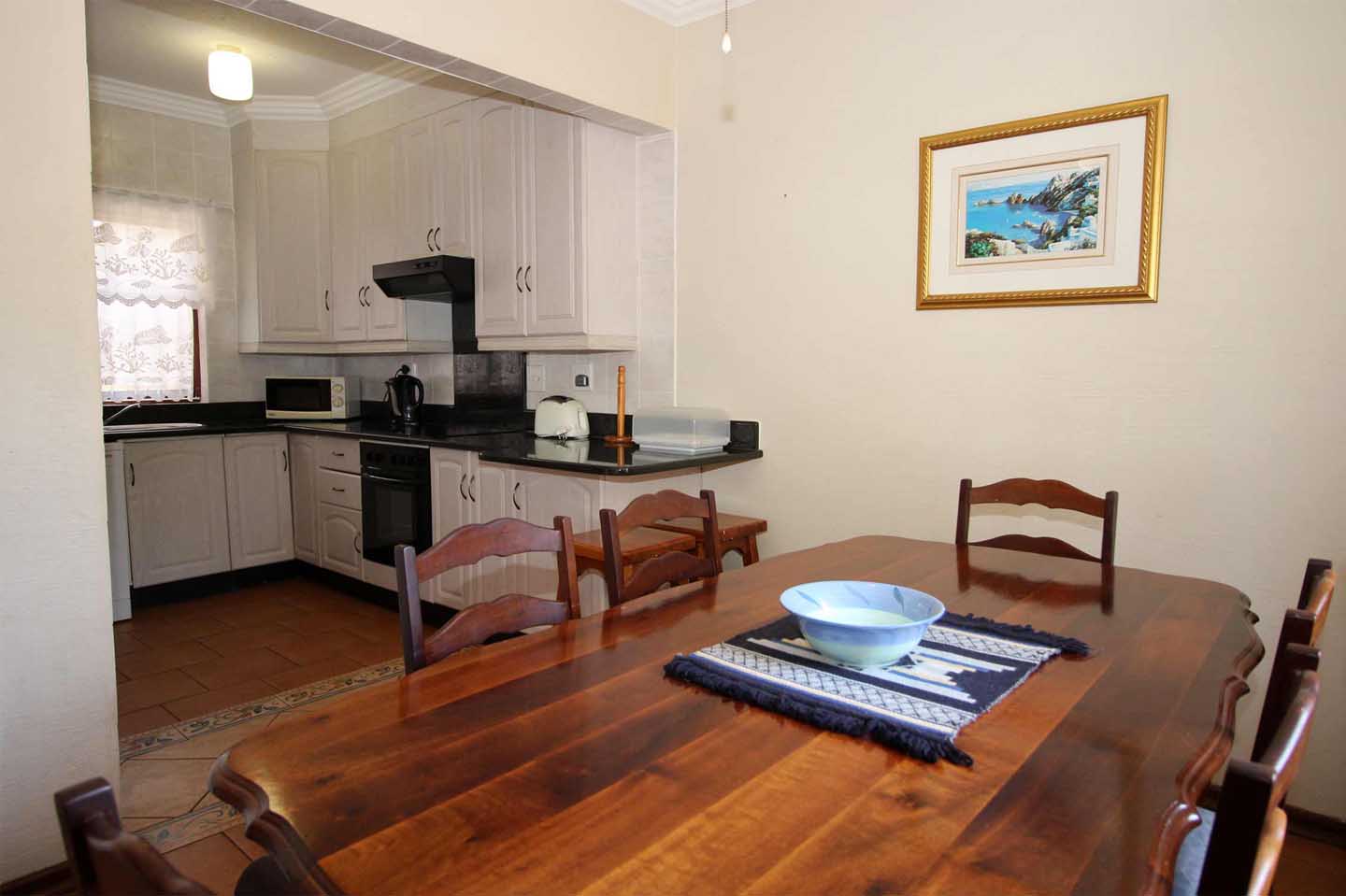 The kitchen is leads into the dining room and has a dishwasher to help with the cleaning up. The lounge leads out onto the open sundeck with a built in charcoal braai. The flat is well equipped with DSTV provided, a washing machine and a tumble drier. The apartment has ceiling fans in the main, 2nd, and 3rd bedrooms to keep you cool in summer.